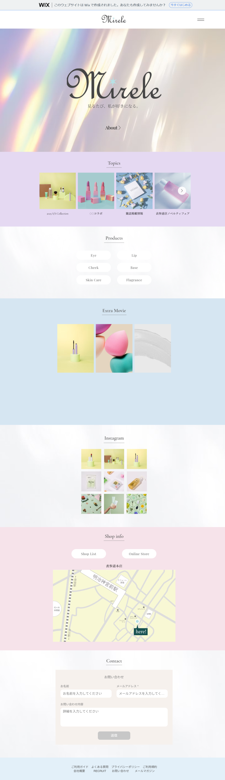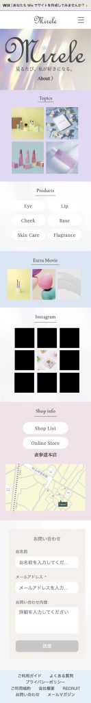 ホームページ制作 2025-11-05 最終更新日時 : 2025-11-15 milk 架空のコスメブランド「mirele」のHPデザイン 製作時間:20時間使用ツール:WIX意識したこと:ブランドの世界観が一目で伝わり、まとまりのあるデザインになるよう意識しました https://summer127k.wixsite.com/mirele